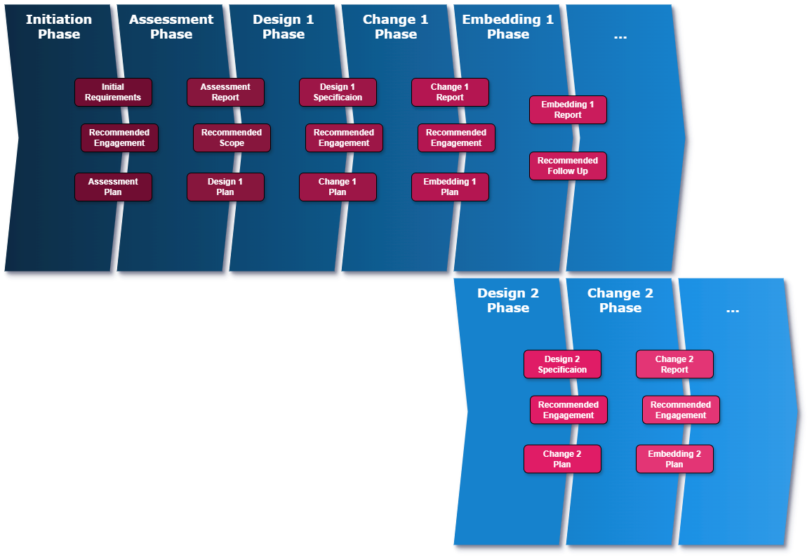 A tailor-made transformation path, starting from the initial assessment and designed to improve your organization in aspects most suiting the purpose you want to realize.